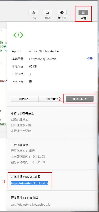 7.上传代码完成之后,点击右上角的【详情】按钮,接着选择【腾讯云状态】即可看到腾讯云自动分配给你的开发环境域名: