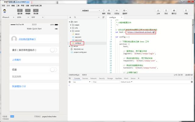 8.完整复制(包括?https://)开发环境?request?域名,然后在编辑器中打开?client/config.js?文件,将复制的域名填入?host?中并保存,保存之后编辑器会自动编译小程序,左边的模拟器窗口即可实时显示出客户端的?Demo: