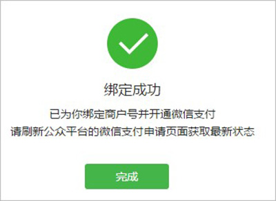 3、验证成功后,将会进入绑定成功页;你可通过该商户号进行微信支付的开发,通过该商户号进行收款。看到绑定成功提示后,你的微信支付功能已成功开通,请刷新公众平台的微信支付申请页获取最新状态。如下图所示: