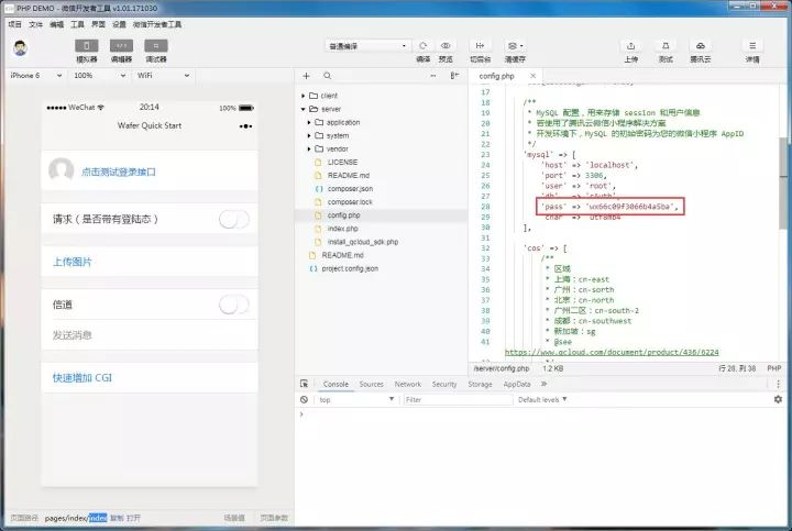 4.打开?Demo?代码中?server?目录下的?config.php?文件,将其中的?mysql?配置项的密码?pass?改成你的微信小程序?AppID,并保存。