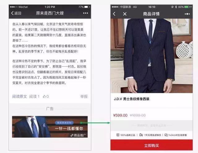 以后,公众号文章不仅可以看到公众号的广告,还能看到小程序广告。这个广告以图文、图片或优雅大图形式展现,点击可以跳转到小程序指定页面。小程序运营者们准备好砸钱了吗!